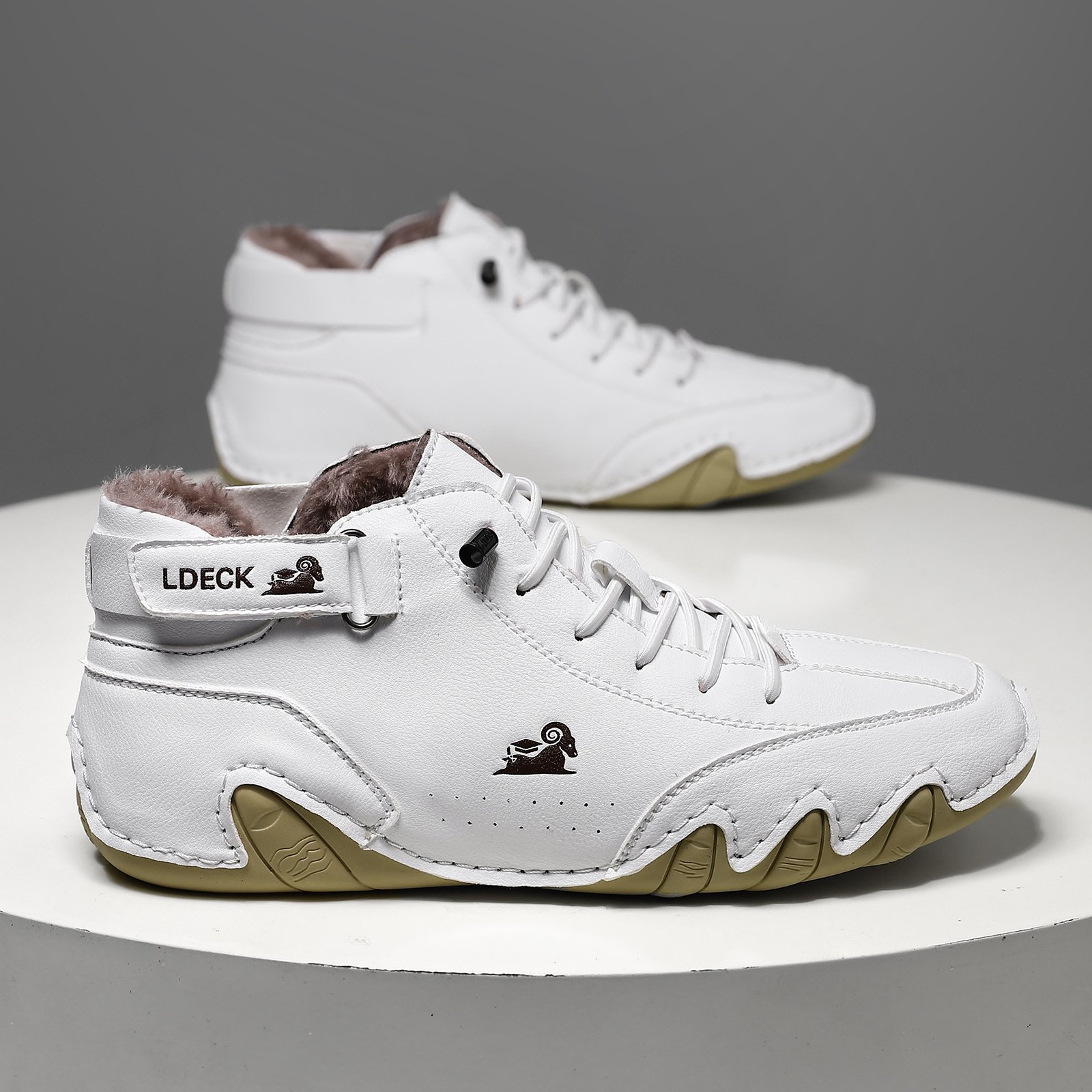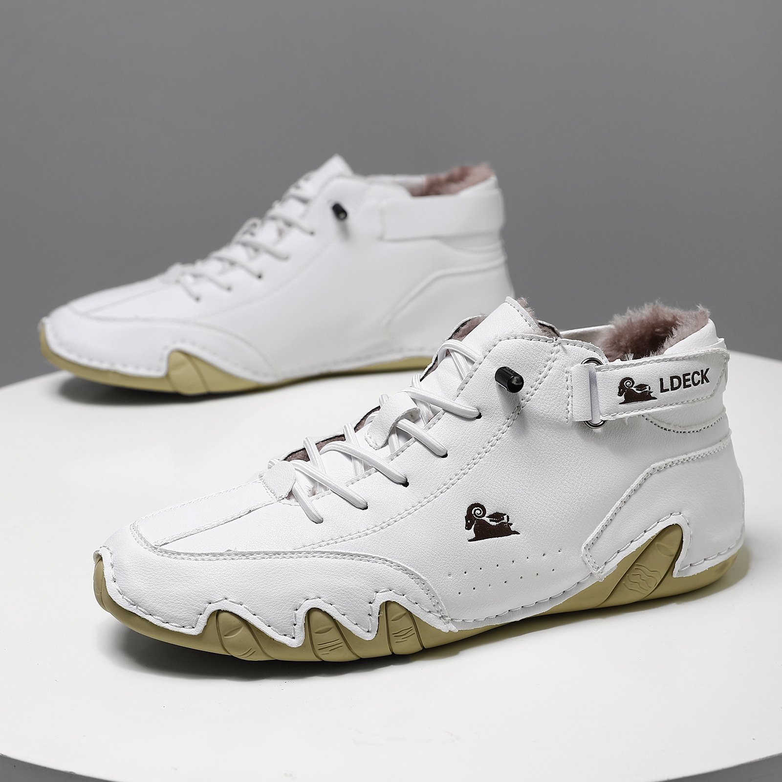Step into ultimate comfort with these sophisticated mens’ driving shoes, perfect for cold weather. Crafted with a premium, sleek white leather upper, they feature a plush, thick fur lining that extends to the ankle collar for exceptional warmth. A unique, adjustable ankle hook-and-loop strap with polished metal hardware provides a custom fit and a contemporary look.